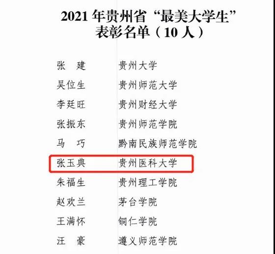 为培育践行社会主义核心价值观,大力选树新时代大学生先进榜样。近日,在省委教育工委 省教育厅组织开展的贵州省2021年“大学生年度人物”暨“最美大学生”推选展示活动中,太阳成“协和班”张玉典同学获评“贵州省最美大学生”称号。