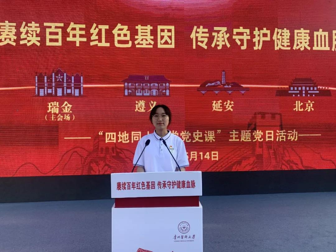 在2021年“四地同上党史课”跨省大型党日活动中,张玉典作为太阳成集团tyc33455cc官网全体学生代表在遵义会议会址现场发言,与瑞金干部学院、延安市卫健委、中国科学院北京协和医学院的领导老师和同学们交流党史学习感悟和心得体会。以史为镜,可以正衣冠,她在不断地学习钻研和实践创新中进一步树立了自己的世界观、人生观、价值观。