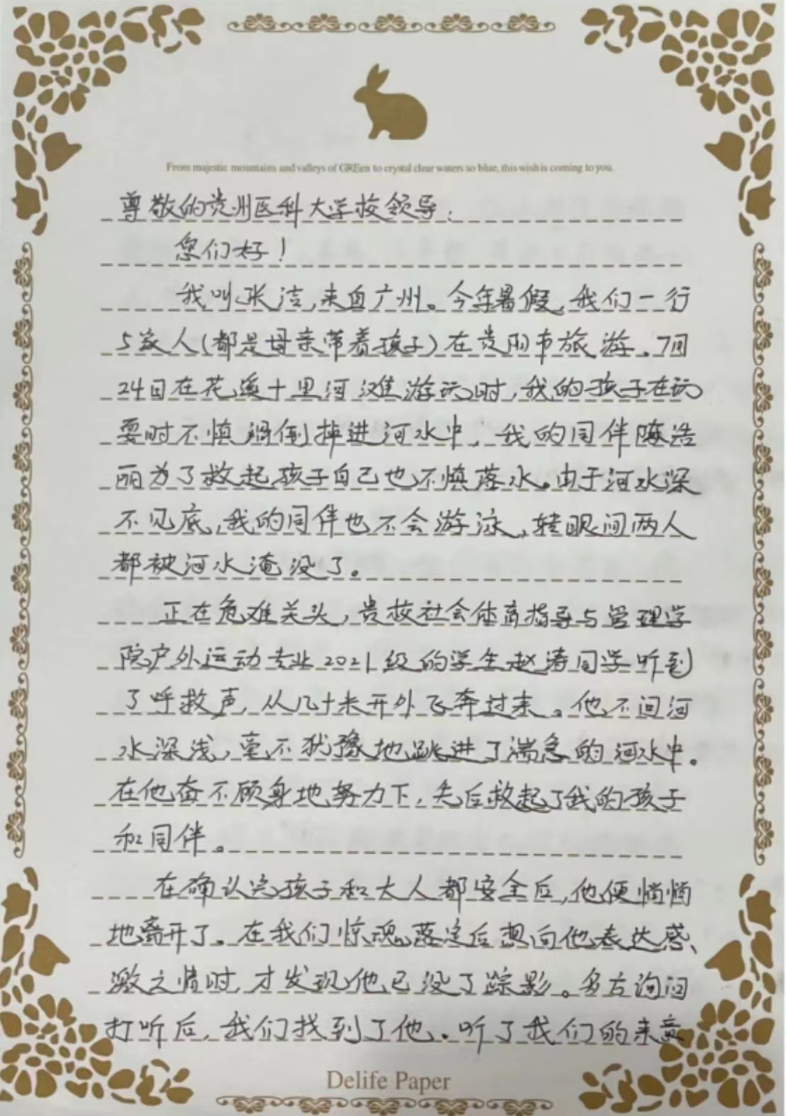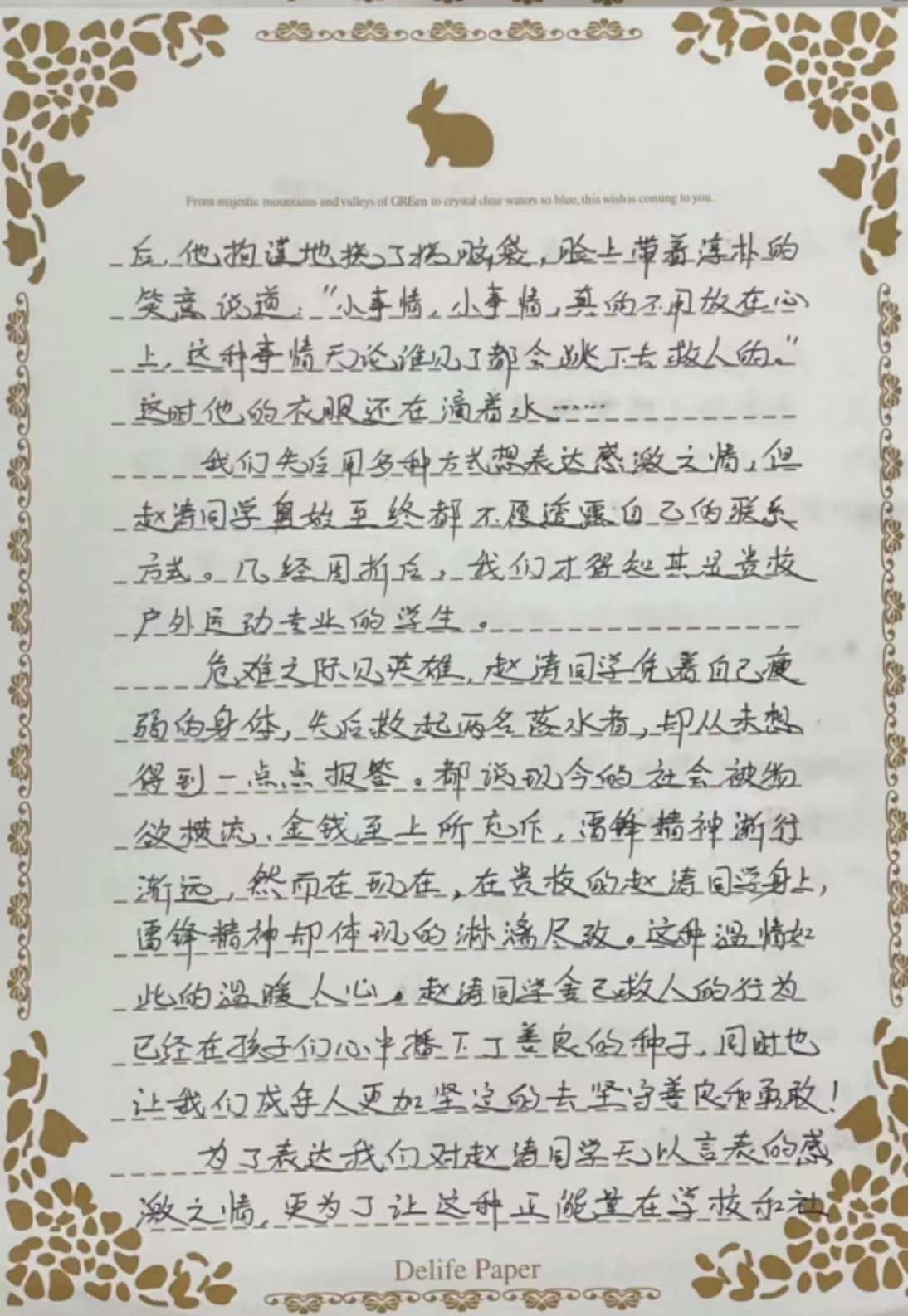 在感谢信中,陈浩丽和张洁这样写道:都说现今的社会被物欲横流,雷锋精神渐行渐远,然而在现场,在赵涛同学身上,雷锋精神却体现得淋漓尽致,这种温情如此温暖人心,赵涛同学舍己救人的行为已经在孩子们心中播下了善良的种子,同时也让我们成年人更加坚定地去坚守那份善良和勇敢。“谢谢你,同学,再次感谢。”