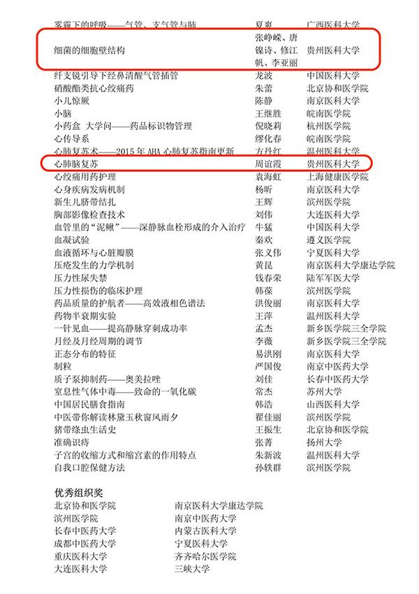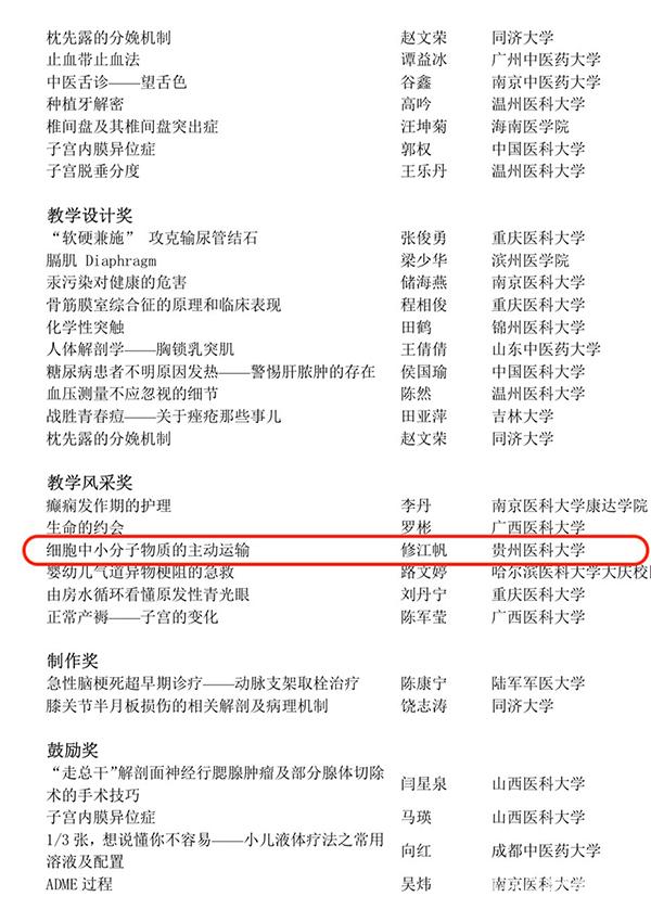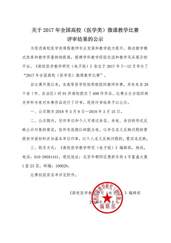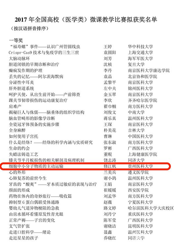 近日,2017年第四届全国高校(医学类)微课教学比赛公布结果,太阳成获得一等奖1项、三等奖1项、鼓励奖2项、教学风采奖1项,同时学校获得优秀组织奖。