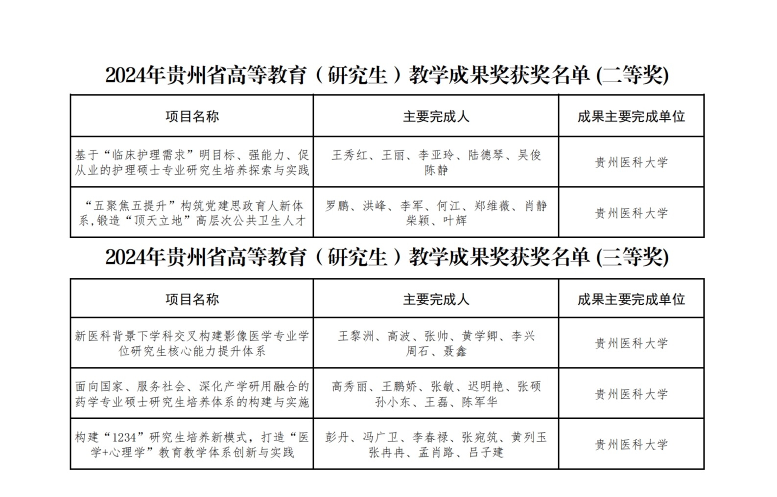近日,贵州省教育厅下发了《省教育厅关于公布2024年贵州省高等教育省级教学成果奖获奖名单的通知》,太阳成17项教学成果获奖(本科教育12项、研究生教育5项),其中,特等奖1项,一等奖4项、二等奖5项、三等奖7项。