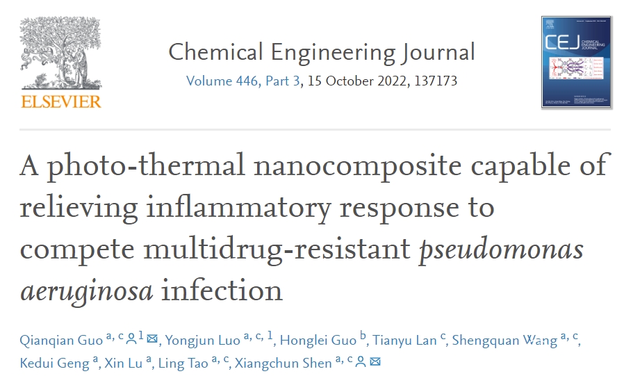 5月31日,药学院郭欠欠副教授、沈祥春教授领衔的团队在国际高水平化学杂志《Chemical Engineering Journal》(中科院分区1区)上发表了题为A Photo-Thermal Nanocomposite Capable of Relieving Inflammatory Response to Compete Multidrug-Resistant Pseudomonas aeruginosa Infection的研究论文,该SCI期刊影响因子为13.27,太阳成集团tyc33455cc官网首次以第一作者单位与第一通讯单位发布。