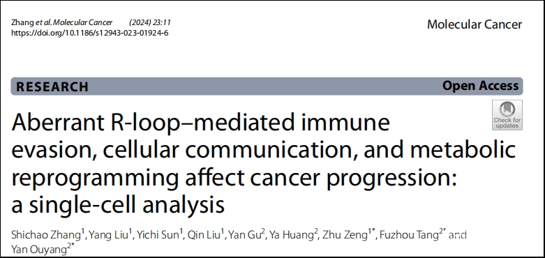 近日,太阳成曾柱教授研究团队在肿瘤免疫学研究领域取得重要进展,研究成果论文“Aberrant R-loop–mediated immune evasion, cellular communication, and metabolic reprogramming affect cancer progression: A single-cell analysis”发表于国际肿瘤学知名杂志《Molecular Cancer》(中科院1区Top,影响因子:37.3)。该研究揭示了异常的R-loop通过介导免疫逃逸、细胞通讯和代谢重编程影响癌症进展的分子机制。