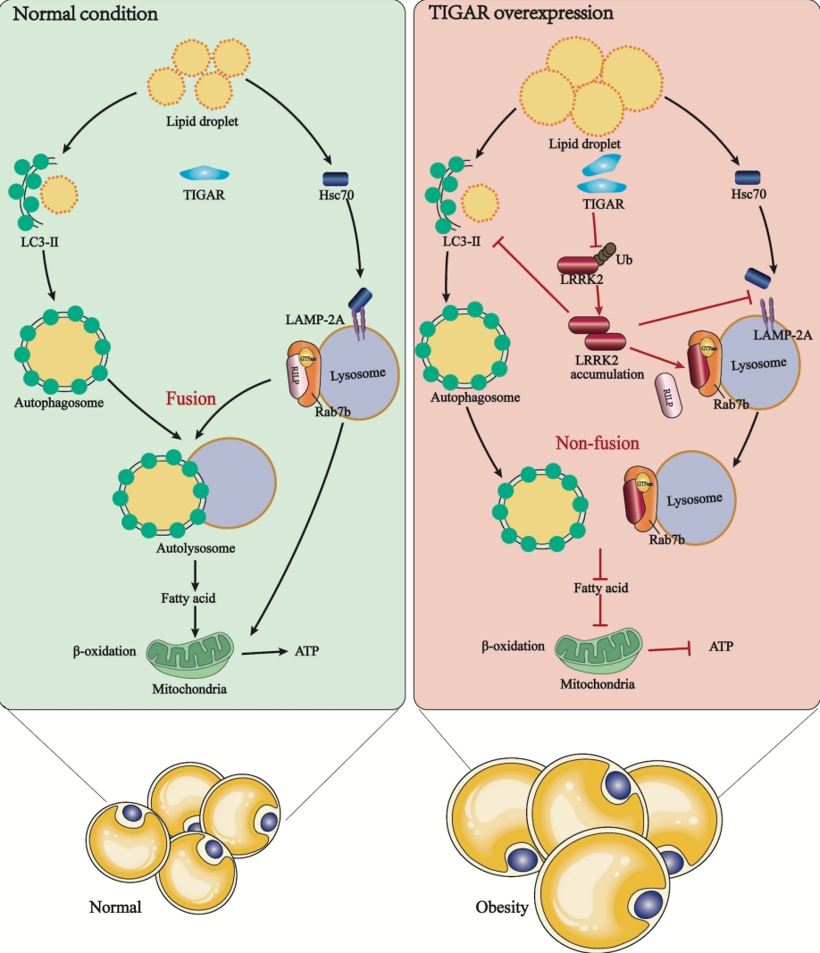 该研究首先从正常饮食喂养的全身性过表达TIGAR转基因小鼠(TG鼠)中观察到明显的肥胖表型,检测到糖脂代谢相关指标出现紊乱。另外,通过非靶向脂质组学检测也发现TG鼠白色脂肪组织中脂质组分明显失调。为了进一步明确其中的分子机制,采用RNA-Seq技术发现在TG鼠白色脂肪组织中Lrrk2和Rab7b基因水平明显上调,同时,研究还发现了TIGAR可以促进富亮氨酸激酶LRRK2和RAB7B相互作用抑制脂肪细胞中脂滴的溶酶体降解。接下来,研究者证实了在3T3-L1脂肪细胞中过表达TIGAR通过抑制LRRK2的泛素-蛋白酶体降解,从而抑制巨自噬和分子伴侣自噬(CMA),最终导致脂质沉积,进而加剧肥胖。另外,本研究还制备了脂肪组织靶向纳米制剂DNL201-NE(DNL201为LRRK2特异性抑制剂),通过尾静脉注射发现DNL201-NE在小鼠脂肪组织中激活了自噬并减轻了小鼠的肥胖。综上所述,该研究表明TIGAR在脂肪细胞中通过富亮氨酸激酶LRRK2抑制巨自噬和CMA,在脂质代谢甚至肥胖中发挥着至关重要的作用。这些研究表明TIGAR有望成为治疗肥胖和代谢相关疾病的关键靶点。