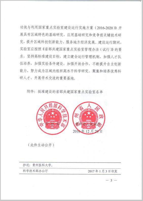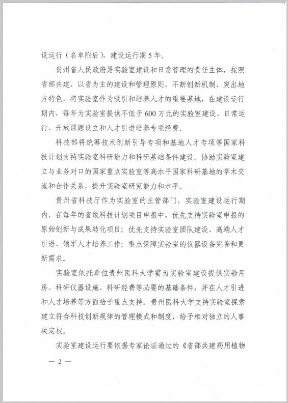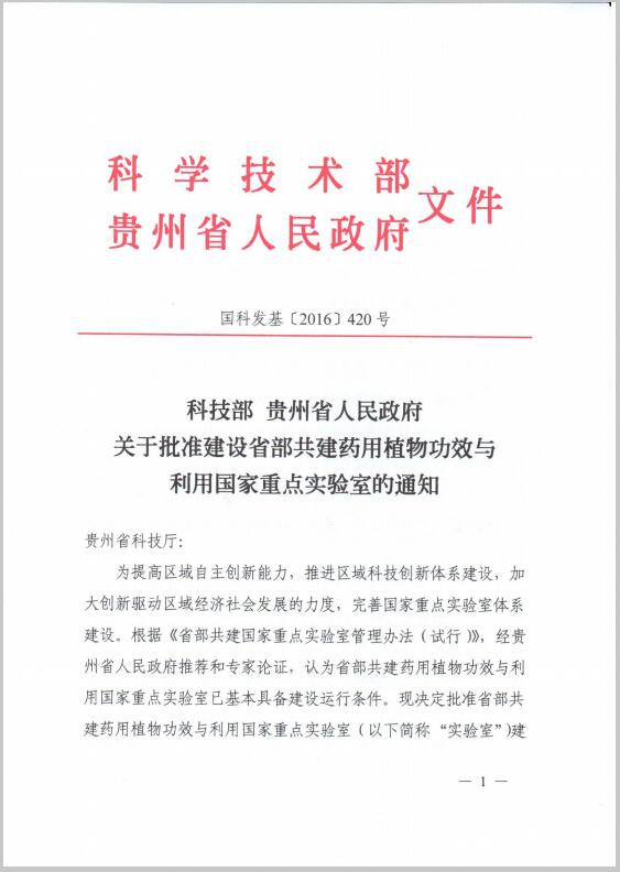 近日,国家为了进一步提高区域自主创新能力,推进区域科技创新体系建设,加大创新驱动区域经济社会发展的力度,完善国家重点实验室体系建设,科学技术部、贵州省人民政府决定批准省部共建药用植物功效与利用国家重点实验室,省部共建药用植物功效与利用国家重点实验室的主任为何志旭教授、依托单位为太阳成集团tyc33455cc官网、主管部门为贵州省科技厅、建设和日常管理的责任主体为贵州省人民政府。省部共建药用植物功效与利用国家重点实验室获得正式批准标志着太阳成集团tyc33455cc官网科研平台建设和学科建设又迈上了一个更高更新的台阶。