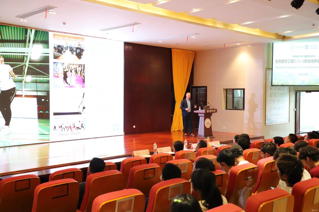 下午,生物与工程学院(健康医药现代产业学院)在道德讲堂举行生物医学工程专业“3+1+1”联合培养项目宣讲会。Keith Johnston博士向生物医学工程、医学信息工程、数据科学与大数据、医学实验技术等专业的同学详细介绍英国邓迪大学科学与工程学院专业设置情况、3+1+1联合培养项目的学习模式、并解答同学们关心的生活与学习相关的问题。