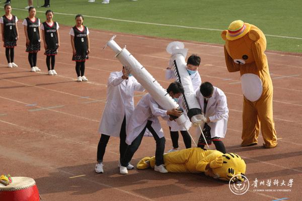 在激情昂扬的运动员进行曲中,国旗护卫队、学院代表队、教职工代表队等数十个方队依次经过主席台,嘹亮的口号、整齐的步伐,展现出全校教职医护员工生昂扬的精神状态。特别是每个学院派出的方队,都进行了富有创意的特色展示,绚丽的服装、醒目的标语、变幻的队形,赢得了在场师生的阵阵喝彩和掌声。