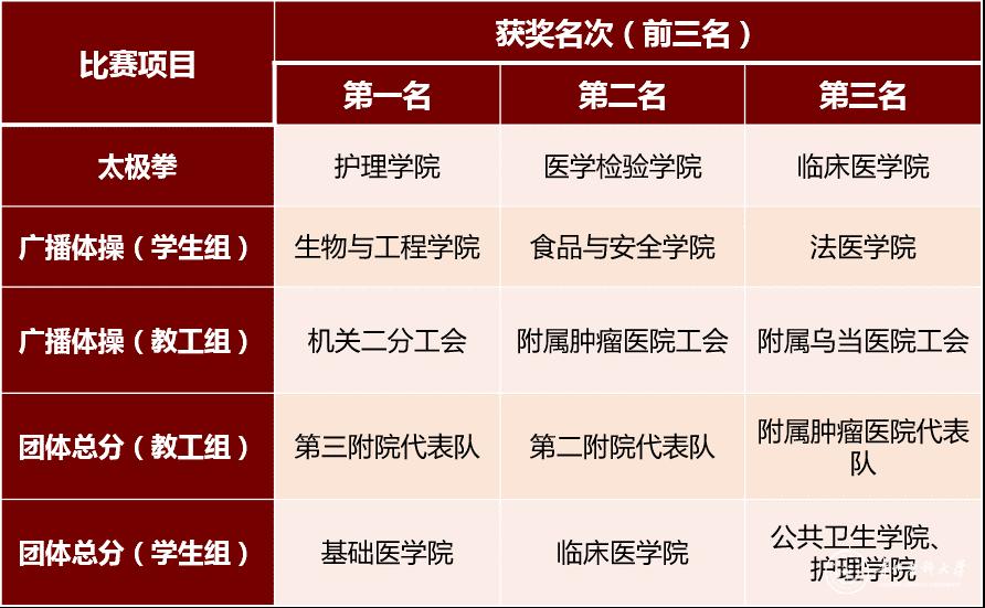 本届校运会中,公共卫生学院余海宁200m以23″80的成绩打破了原24″00的校纪录,基础医学院吴明俊跳高以1.90m的成绩打破了原1.82m的校运会纪录。