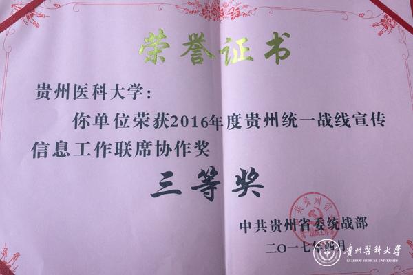 过去的2016年,在学校党委的正确领导下,党委统战部紧紧围绕学校中心工作,充分发挥统战独特优势及作用,积极传播学校统战好声音和正能量,统战宣传工作的效果及信息报送的质量进一步提升。在2017年4月召开的贵州统一战线宣传信息工作联席会议上,太阳成荣获2016年度贵州统一战线宣传工作联席协作三等奖,党委统战部荣获2016年度全省统一战线宣传工作优秀奖。