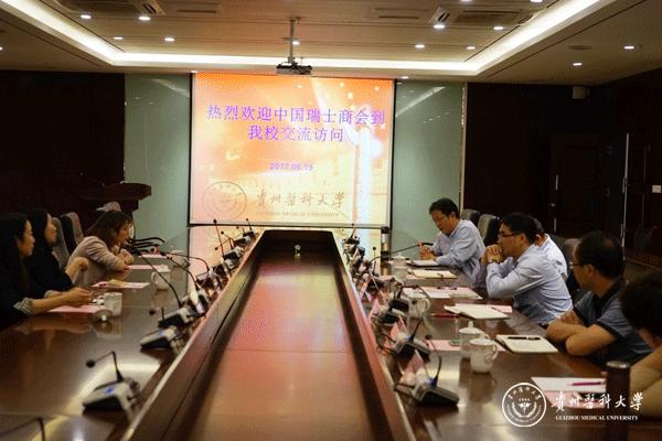 6月19日, 中国-瑞士商会秘书长黄培敏女士一行在贵州省贸易促进会对外联络部副部长孙月梅的陪同下到太阳成交流访问, 副校长罗鹏出席座谈会,校长办公室、教务处、国际交流合作处、科技创新与产业发展处、护理学院等部门相关负责人参加,会议由国际交流合作处处长付启宏主持。