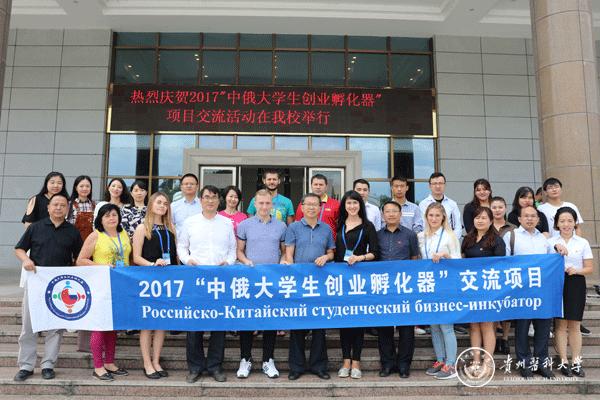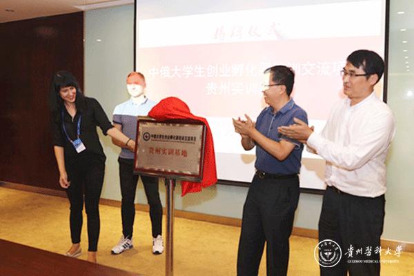 罗鹏、孙保华、别洛夫·亚历山大为中俄大学生创业孵化器培训交流项目贵州实训基地揭牌。