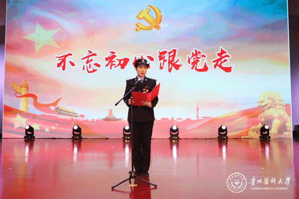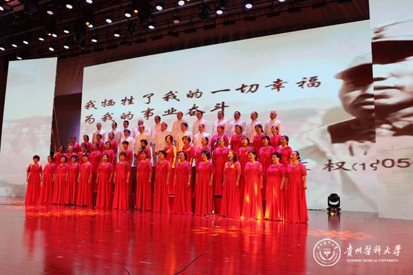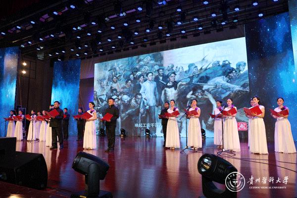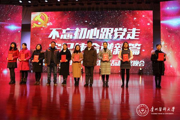 晚会以舞蹈《追寻》拉开帷幕,诗朗诵《我心飞翔,献给您的颂歌》、独唱《天耀中华》、舞蹈《欢歌共舞》等展现了青年一代“贵医人”团结向上、拼搏奋进的精神风貌,合唱《心里装着谁》、《没有共产党就没有新中国》演绎了老一辈“贵医人”热爱生活、忠诚选择的可贵品质。此外,在《微宣讲》活动环节,党的十九大代表、太阳成优秀校友赵晶晶用切身体会生动讲述了一名基层党员民警代表执着信仰、坚守岗位、无私奉献的心路历程;在访谈活动环节,三位优秀的教师代表——秉承让科研服务临床理念的外科医生孙发老师、药学科研工作者汤磊老师、抗癌一线的医务工作者苏胜发老师分别讲述了各自的亲身经历,用朴实的语言、动人的故事、浓烈的激情向在座的老师和同学们传递了献身医药卫生管理事业、执着科研创新、勇攀科学高峰的医学正能量。