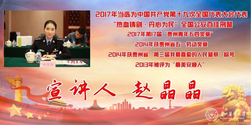 报告会上,赵晶晶回忆讲述了参加党的十九大和习近平总书记在贵州代表团讨论时的深切体会和内心感悟。赵晶晶讲到,作为一名基层党员民警代表,荣耀参加中国共产党第十九次全国代表大会,第一次走进庄严的人民大会堂,现场聆听习近平总书记作党的十九大报告,倍感自豪、终身难忘。荣誉源于母校的教导培养,也源于组织的悉心关怀。