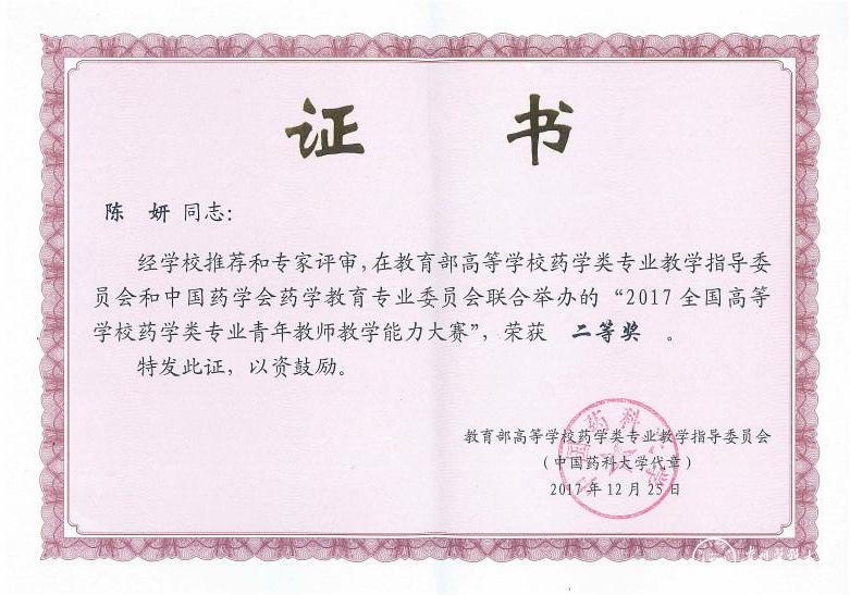 由教育部高等学校药学类专业教学指导委员会和中国药学会药学教育专业委员会联合举办的2017全国药学院校教学学术“钟山论坛”暨高等学校药学类专业青年教师教学能力大赛决赛于12月24日-26日在南京举行。来自中国药科大学、复旦大学药学院、四川大学华西药学院、浙江大学药学院等全国43所药学院校的教师,分为药理组、药剂组、药物分析组和药物化学组四组。太阳成药学院沈祥春教授应邀担任决赛评委。药学院中药药理学教研室陈妍教授参加药理组的比赛,经过激烈角逐,最终在本次大赛中取得了“2017全国高等学校药学类专业青年教师教学能力大赛二等奖”。这是太阳成首次参与教育部药学教学指导委员会组织的全国药学类青年教师大赛,对提升太阳成药学教育的影响力,提高青年教师的教学能力具有促进作用。