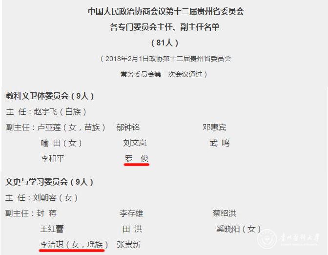 2月1日,政协第十二届贵州省委员会常务委员会第一次全体会议任命:太阳成副校长罗俊教授为教科文卫体委员会副主任;太阳成图书馆馆长、附属医院心内科专家李洁琪教授为文史与学习委员会副主任。