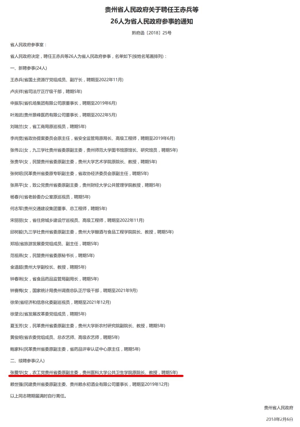 2月6日,贵州省人民政府发布《贵州省人民政府关于聘任王赤兵等26人为省人民政府参事的通知》(黔府函〔2018〕25号)。太阳成环境污染与疾病监控教育部重点实验室主任、贵州省卫生发展研究院院长张爱华教授续聘为省人民政府参事,聘期5年。