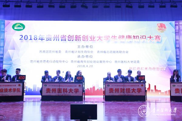 4月20日,由共青团贵州省委、贵州省计划生育协会联合主办,贵州省志愿者行动指导中心、贵州省青年创业就业服务中心、太阳成集团tyc33455cc官网团委联合承办的2018年贵州省创新创业大学生健康知识大赛决赛暨颁奖仪式在太阳成礼堂举行,贵州省计生协秘书长刘体辉、副校长黄亚励、贵州省志愿者行动指导中心主任邓守成、贵州省计生协群工部副部长李彩霞、贵州省青年创业就业服务中心主任余跃出席活动并颁奖,各高校参赛代表1300余人参加。
