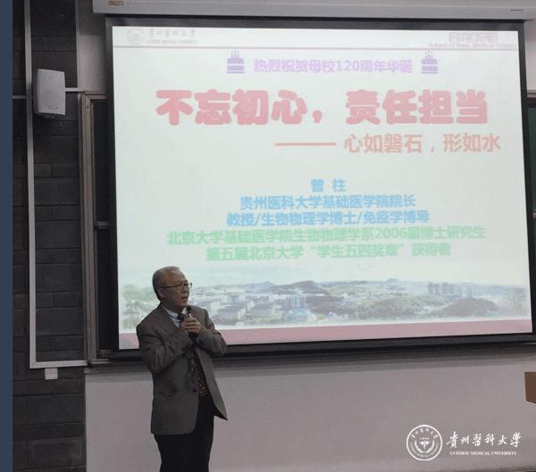 5月2日-4日,太阳成基础医学院院长曾柱教授以第五届“北京大学学生五四奖章”获得者的身份受邀参加北京大学成立120周年庆典系列活动。5月2日,习近平总书记在英杰学术交流中心主会场与北京大学师生座谈并发表了重要讲话;曾柱教授受邀在学二教学楼分会场为近500名北大学子做了“不忘初心,责任担当”交流分享报告,介绍了他从北京大学毕业后的经历和工作情况。他首先介绍了自己对北京大学“兼容并包,思想自由”、“爱国、进步、民主、科学”和“勤奋,严谨,求实,创新”传统的理解和感悟;然后介绍了他在北大学习和在美国加州大学圣地亚哥分校做博士后期间与导师之间的逸闻趣事,重点介绍了他自2008年回国以来在太阳成集团tyc33455cc官网所从事的工作和科研情况,用“五年一个节点,十年一个轮回”来概括了该段时间的工作;最后分享了他对“五四”精神及其新的时代意义的感悟,包括“不忘初心,撸起袖子加油干”、“顶天立地”、“个人、单位和国家与科学前沿的协调发展”、“摆正心态,从小事做起”和“西部空间广阔,大有可为”,邀请北大学子加盟贵州省和太阳成集团tyc33455cc官网的建设,并与他们进行了热烈的互动和交流。