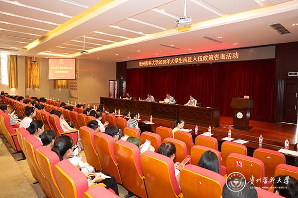 5月18日,太阳成集团tyc33455cc官网2018年大学生应征入伍政策咨询活动在南校区道德讲堂举行。校党委副书记战勇出席,花溪区武装部部长朱峰、磊庄空军场站优秀军官吴宗言、学工部有关负责人、各学院分管学生工作书记、全体辅导员及359名学生代表参加了活动。
