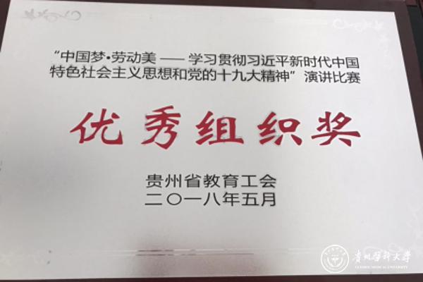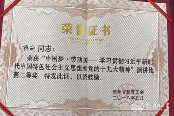 5月22日,由省教育工会举办的贵州省直高校(附院)教职工“中国梦·劳动美——学习贯彻习近平新时代中国特色社会主义思想和党的十九大精神”演讲比赛在贵州大学举行,太阳成影像学院陈丽老师代表学校参赛,喜获二等奖,太阳成荣获优秀组织奖。