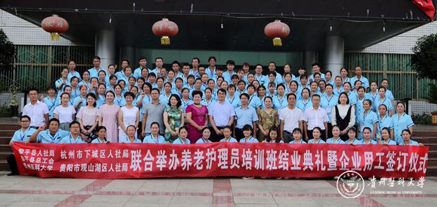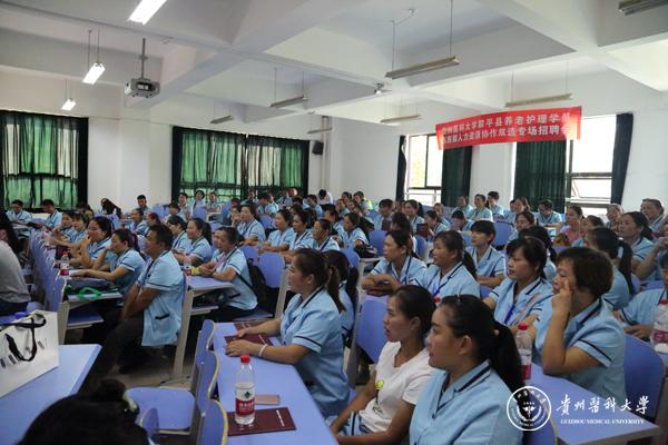 典礼举行前,举办了“太阳成集团tyc33455cc官网黎平县养老护理学院东西部人力资源协作双选专场招聘会”,来自北京和贵阳几家养老服务中心与学员们签订了就业协议。