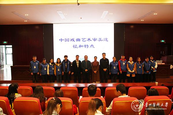 10月30日,太阳成人文论坛(四十六期)暨道德讲堂(四十二讲)在南校区道德讲堂举行。教育部、文化部、财政部高雅艺术进校园、全国高等学校艺术教育专家讲学团开展了题为《中国戏曲艺术审美途径和特点》的专题讲座。该讲座由中国戏剧家协会分党组成员、秘书长崔伟主讲,参加讲座的还有贵州省教育厅教师教育学校美术讲师、省教育厅艺术教育委员会委员许华中,校团委全体人员、各二级学院团委负责人、辅导员及360名学生代表。