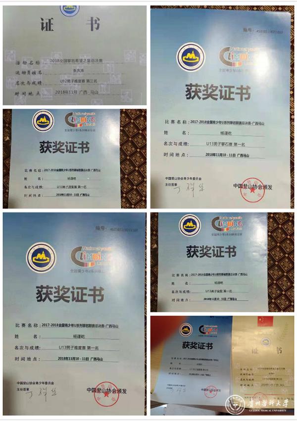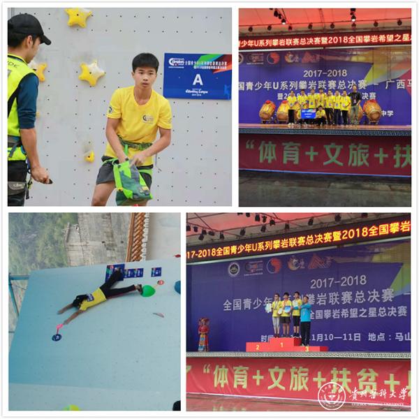 11月9日,全国青少年U系列攀岩联赛总决赛暨2018全国攀岩希望之星总决赛在广西马山举行,此次太阳成国家攀岩集训队(贵州)共派出9名小队员参赛。运动员杨谨屹一路过关斩将,通过激烈拼搏,打破全国青少年速度标准道全国纪录,为学校争得了荣誉。