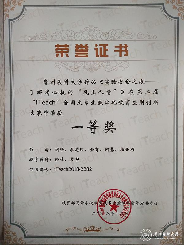 本次大赛由高等学校教育技术教学指导分委员会、华中师范大学主办。大赛以“信息化+教育应用+创新”为主题,旨在引领高校大学生关注教育发展、理解教育需求的同时,面向真实需求进行作品开发,通过学以致用的实践培养创新能力和合作意识,提高综合素质。参赛对象面向全国(含港、澳、台)普通高等学校的全日制在籍在读大学生。太阳成基础医学院吴宁、电化教学中心徐林老师指导选手胡盼、李志阳、金育、何慧、杨云巧的作品《实验室安全之旅—了解离心机的风土人情》进入决赛,并荣获一等奖。