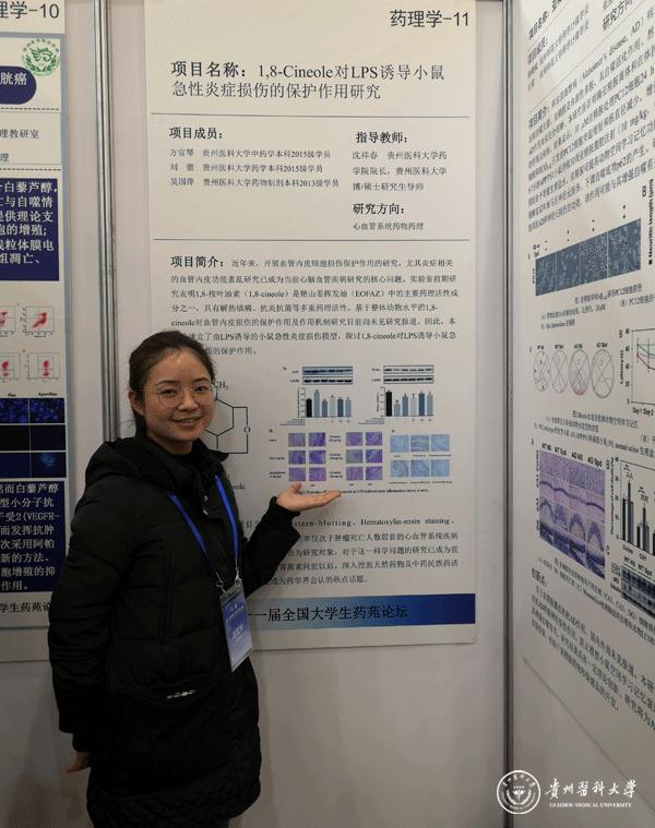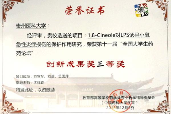 12月7日至9日,第十一届全国大学生药苑论坛在浙江大学紫金港校区举行,太阳成药学院组织学生参加, 2015级药学专业学生方官琴、刘蕾等完成的《1,8-Cineole对LPS诱导小鼠急性炎症损伤的保护作用研究》经过墙报比赛、论文评审、论文报告、现场提问以及论坛委员会评议等环节,最终获得创新成果三等奖。