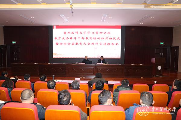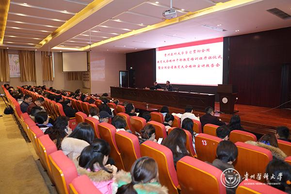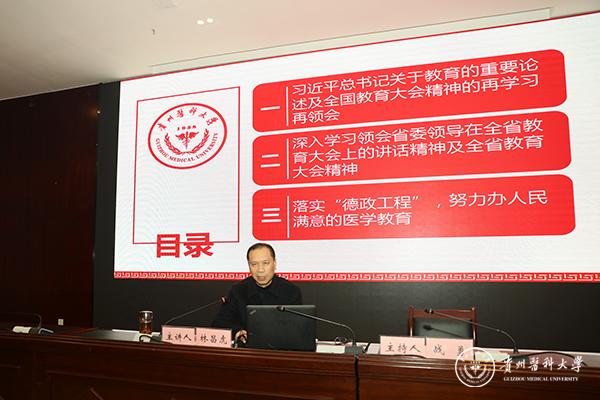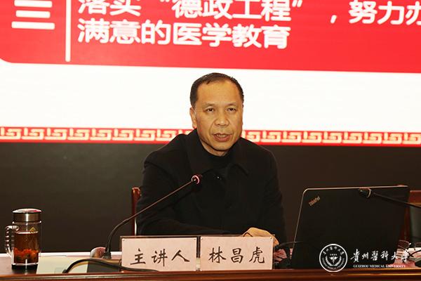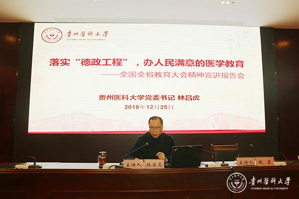 报告会上,林昌虎从“习近平总书记关于教育的重要论述及全国教育大会精神的再学习再领会”,“深入学习领会省委领导在全省教育大会上的讲话精神及全省教育大会精神”,“落实‘德政工程’、努力办好人民满意的医学教育”等三个版块对全国全省教育大会精神作了全面解读宣讲。林昌虎指出,习近平总书记关于教育的系列重要论述及总书记在全国教育大会上的重要讲话是当前和今后一个时期全校做好教育教学工作的根本遵循,对学校全面加强人才培养、科学研究、社会服务、文化传承创新及国际交流合作具有重大的指导意义。林昌虎强调,教育的首要问题是“培养什么人”,关键问题是“如何培养人”,核心问题是“为谁培养人”,高等医学院校要紧紧围绕首要问题、抓住关键问题、把握核心问题,筑牢民族振兴、社会进步的重要基石,推进功在当代、利在千秋的德政工程,着实为实现“两个一百年”奋斗目标和中华民族伟大复兴中国梦培养更多优秀的高素质医药卫生人才。林昌虎要求,全校各单位(部门)要认真学习贯彻全国全省教育大会精神,以新时代贵州教育改革发展新任务为指引,奋力开创教育服务贵州经济社会发展新局面;要紧扣《贵州省推进教育现代化建设特色教育强省实施纲要(2018—2027年)》《关于切实加强全省教育系统党的建设工作的意见》《关于全面深化新时代教师队伍建设改革的实施意见》等重要文件,结合实际研究找准贯彻落实重点,不折不扣地贯彻落实省委、省政府关于教育的决策部署;要明确发展目标、紧跟时代步伐、聚焦主责主业,把立德树人贯穿于人才培养全过程,切实履行好培养担当民族复兴大任时代新人重大使命。