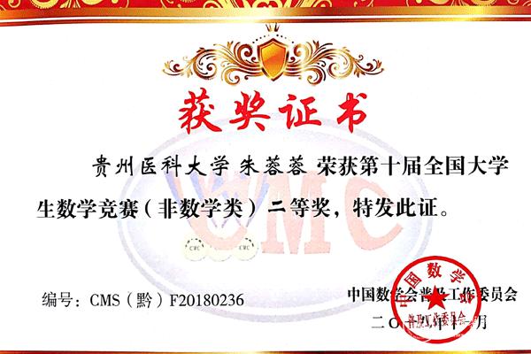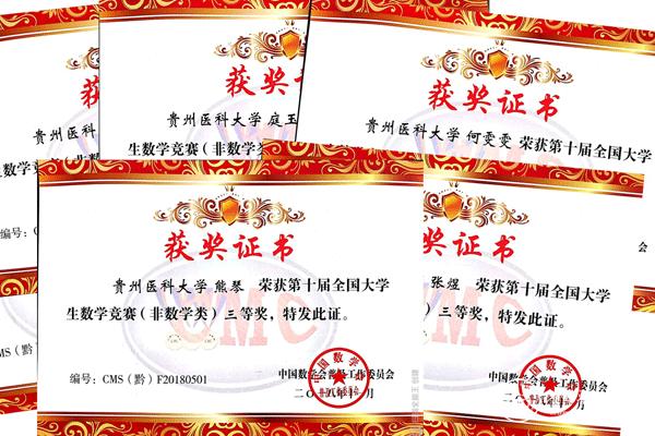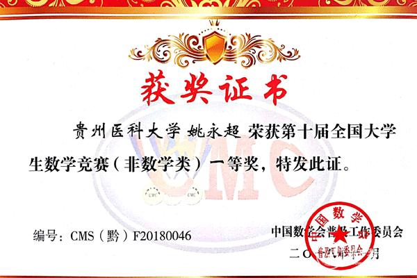 2018年第十届全国大学生数学竞赛贵州赛区共有来自包括贵州大学、贵州师范大学、贵州民族大学、贵州财经大学等21所高校的4855名学生参加。太阳成为这21所高校中唯一的医科类院校。太阳成组织了包括生物医学工程、医学信息工程、生物技术、化学生物学等专业的各年级学生共计101人参加比赛。在与全省各理工科高校的优秀学生的激烈竞争中,太阳成生物与工程学院2017级生物医学工程专业姚永超获得了贵州省赛区一等奖的好成绩,这也是太阳成学子在该项比赛中实现贵州省赛区一等奖零的突破。