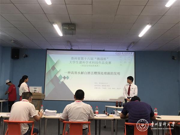 经过现场答辩和文本综合评议,太阳成参赛的4件作品全部获奖。其中,基础医学院作品《苗药“杆努尽烟”对慢性支气管炎大鼠肺组织TLR4及TNF-α表达的影响》、《一种高效水解白酒丢糟预处理液的发明》荣获自然科学类一等奖;临床医学院作品《基于TLR4/MyD88/NF-κB通路探讨绞股蓝皂苷抗动脉粥样硬化的炎症机制》荣获自然科学类三等奖;医药卫生管理学院作品《大健康视角下的居民对医院功能需求调查分析》荣获哲学社科类三等奖。荣获大赛一等奖的作品将代表太阳成参加全国比赛。