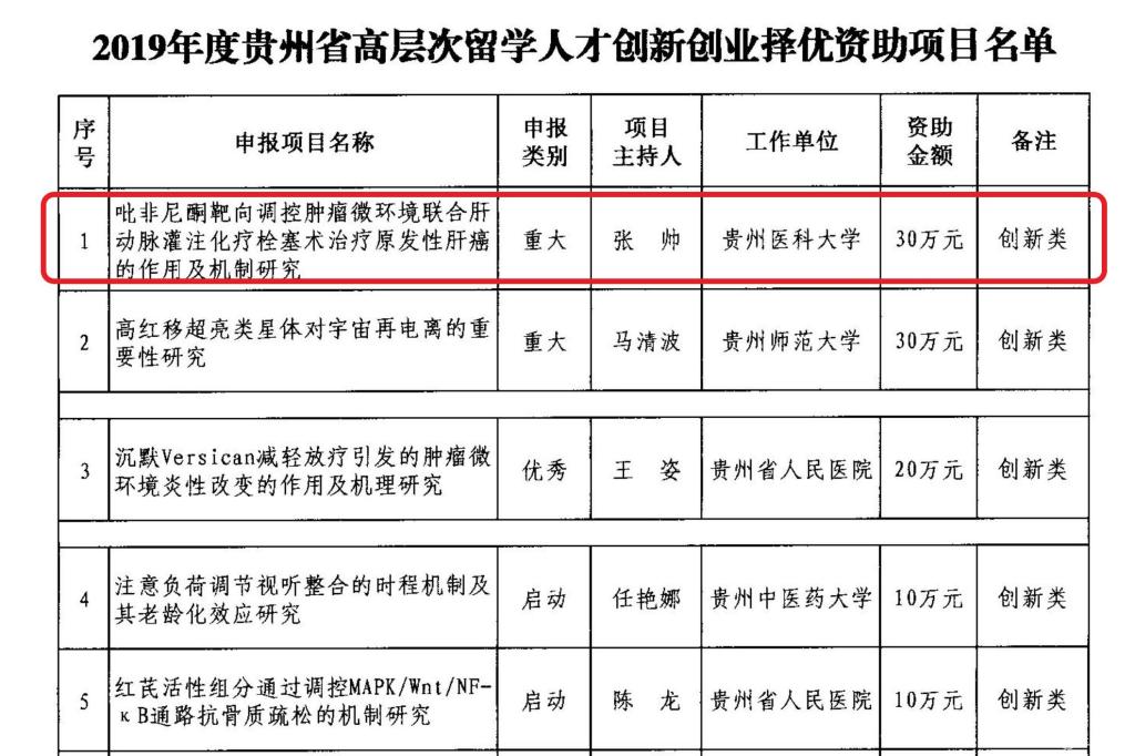 经省人社厅人才服务局的初审以及最终的专家评审和答辩结果,太阳成张帅博士的“吡非尼酮靶向脂质体调控肝星状细胞活性干预肝动脉灌注化疗栓塞术后肿瘤微环境的研究”项目荣获重点项目资助,资助资金30万元。