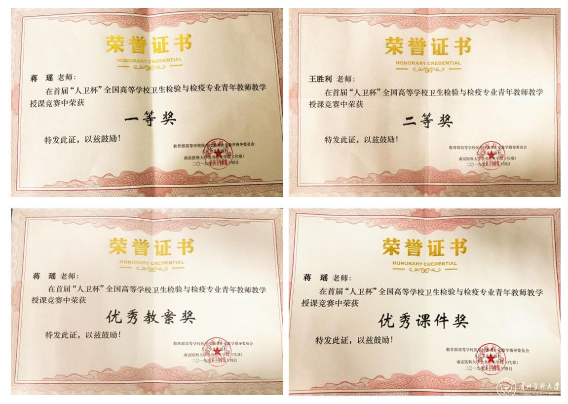 首届“人卫杯”全国高等学校卫生检验与检疫专业青年教师教学授课竞赛得到教育部高校医学技术教指委的高度重视和50所举办卫生检验与检疫专业高校的热烈响应,共有29支代表队54名老师报名参赛,21所院校前往现场观摩。太阳成参赛队由公共卫生学院副院长李军领队。在为期一天半的比赛中,参赛教师根据精心设计的教案和制作精美的课件做了讲课,展现出了良好的精神风貌和较高的授课水平。最终,蒋瑶获微生物检验组教学授课一等奖、王胜利获理化检验组教学授课二等奖,另外蒋瑶还获得优秀课件奖和优秀教案奖。