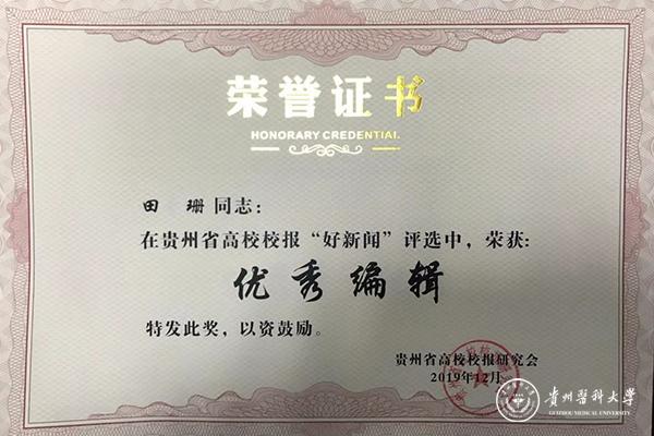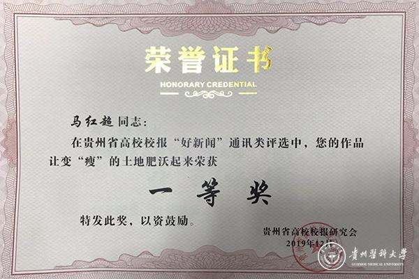 在2018年度全省高校校报好新闻评选中,太阳成校报作品共获5个奖项,一等奖1项,二等奖3项,三等奖1项,优秀编辑1名,优秀学生记者5名。其中,马红超《让变“瘦”的土地肥沃起来》获通讯类一等奖;杜思影《大医精诚》获言论类二等奖,康太艳、陈松江、孙成琴《精彩瞬间》获新闻摄影类二等奖,官方微信作品《外婆的毕业证》获新媒体类二等奖;赵宇红获消息类三等奖,张丽获通讯类三等奖;田珊获“优秀编辑”称号;伍孝东、黄亦思丹、杨山正、雷益、杜青玲获“优秀学生记者”称号。