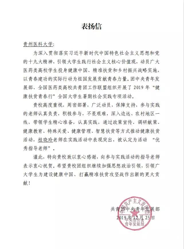 在2019年“健康扶贫青春行”全国高校大学生暑期社会实践专项活动中,太阳成团委副书记桂晓玲在实践活动中表现突出,获“优秀指导老师”称号。