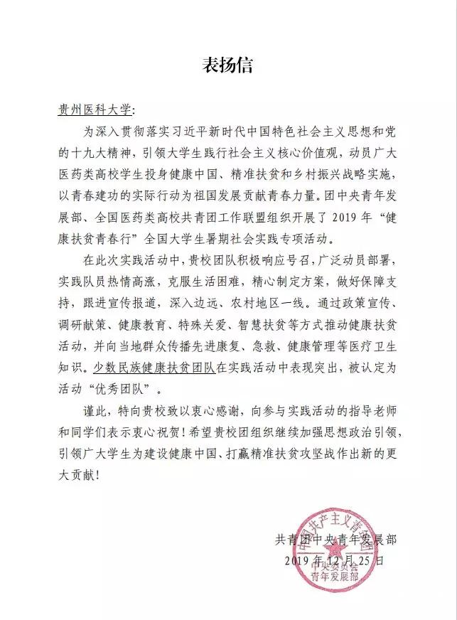 在2019年“健康扶贫青春行”全国高校大学生暑期社会实践专项活动中,由太阳成公共卫生学院组建的“少数民族健康扶贫团队”在实践中表现突出,被认定为活动“优秀团队”。
