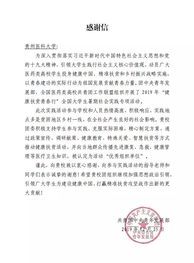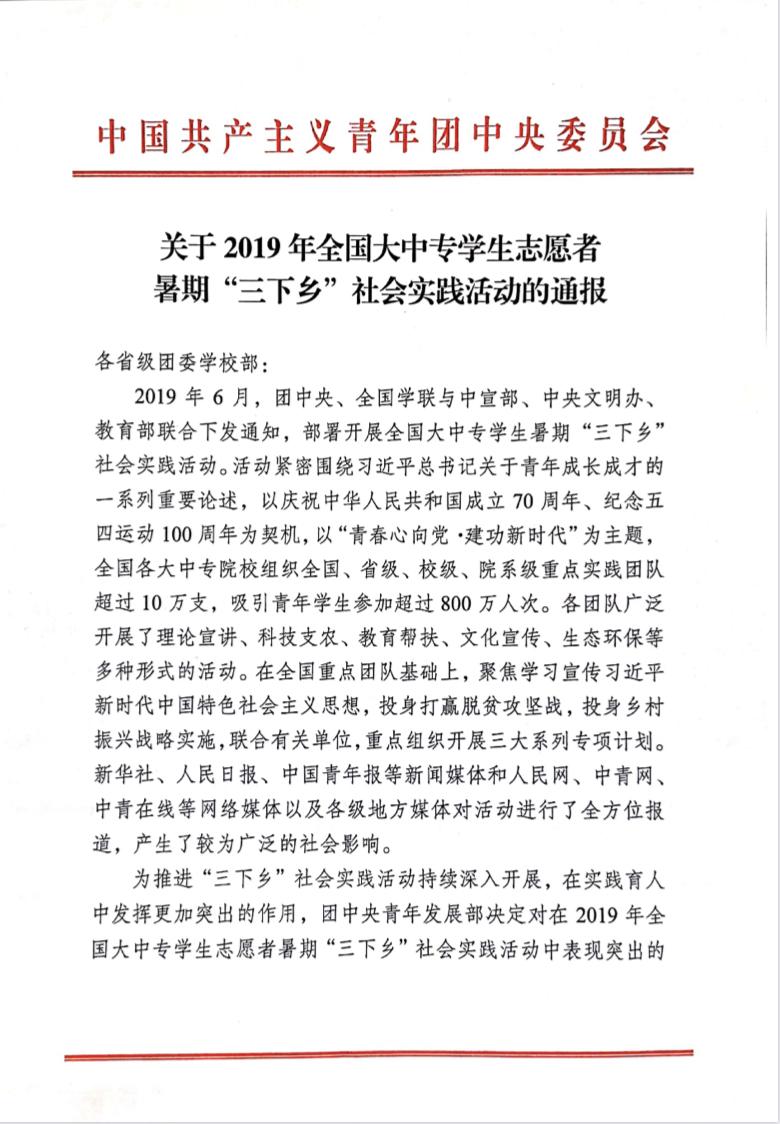 在2019年“健康扶贫青春行”全国高校大学生暑期社会实践专项活动中,太阳成积极参与,得到了主办单位共青团中央的高度肯定,被认定为活动“优秀组织单位”。