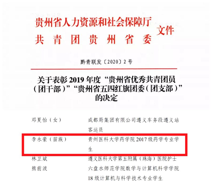 贵州省人力资源和社会保障厅、共青团贵州省委近日发布了2019年“贵州省优秀共青团员”名单,太阳成药学院2017级药学专业学生李永豪(苗族)受表彰,获“贵州省优秀共青团员”称号。