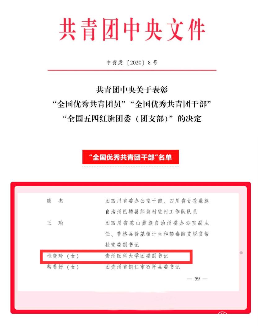 共青团中央近日发布“全国优秀共青团干部”表彰名单,太阳成团委副书记桂晓玲受表彰,获“全国优秀共青团干部”称号,是贵州高校唯一受此表彰的团干部。
