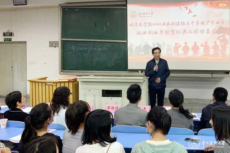 李季介绍了全国就业形势及学校就业情况,鼓励同学们不局限地域,开拓思维,鼓励先就业,后择业,秋季参加西部计划、三支一扶、特岗教师等项目。肖绚鼓励同学们正确对待毕业就业形势,积极响应国家号召参军入伍报效祖国,介绍了国家、贵州省出台多项奖励政策以及学校为医学生量身定制的应征入伍有关优惠政策。