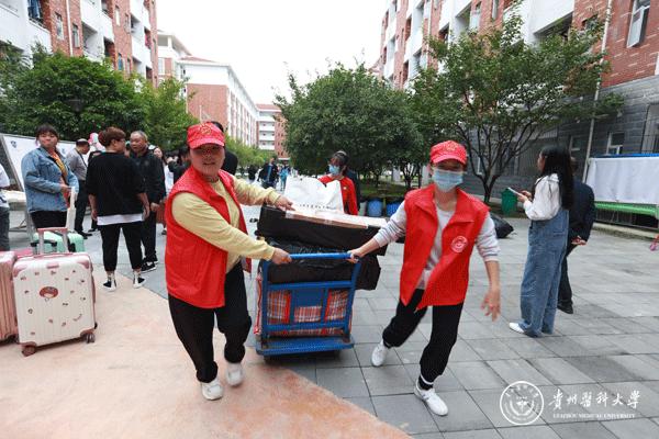 在贵阳火车站、高铁北站、金阳客车站等地,学校设置了迎新点,安排了专车迎接新同学;在校医院及学校东门报到入口处,新同学们在志愿者的指引和帮助下,来到各自学院的迎新报到点。辅导员及学生干部积极为新同学办理入学手续,领取宿舍钥匙,耐心讲解报到注意事项及一卡通使用方法等。因疫情防控需要,新同学家长不入校,为方便新同学搬运行李,学校专门安排了校园交通车进行运送,同时也为志愿者们配备了运送行李的小推车,减轻了大家搬运行李的负担,同时增加了运送的效率,让新同学一进校就感受到学校的关爱备至。