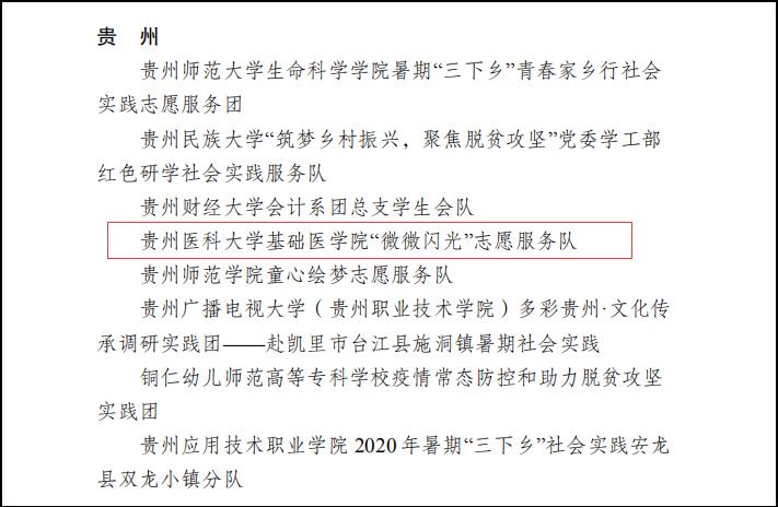 近日,共青团中央对在2020年全国大中专学生志愿者暑期“三下乡”社会实践活动中表现突出的优秀团队予以通报表扬。太阳成基础医学院“微微闪光”志愿服务队荣获“全国社会实践活动优秀团队”称号。