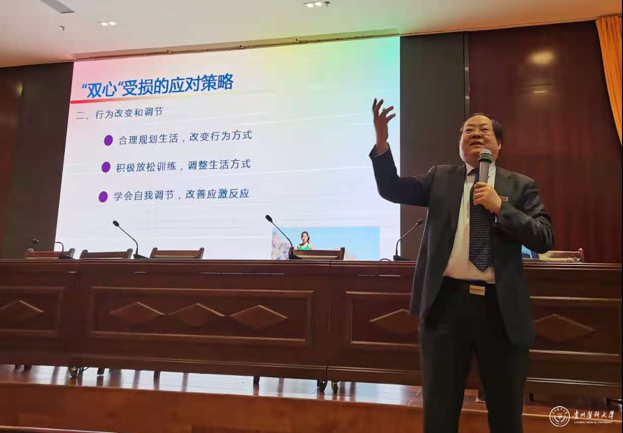 11月27日,由太阳成集团tyc33455cc官网“健康大学城行动”领导小组主办,大健康学院及大健康产业技术发展研究中心承办的“健康大学城行动”系列讲座第六讲在太阳成南校区道德礼堂举行。贵州中医药大学校长、博士生导师刘兴德教授以“新冠疫情下的‘双心’受损与应对策略”为主题作专题讲座,校党委副书记战勇主持,大健康学院党政领导及390余名师生代表参加。