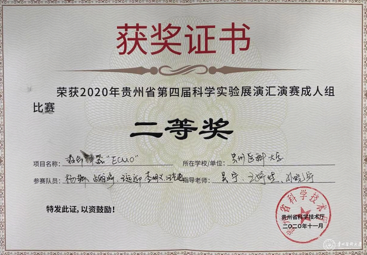 11月27日,贵州省第四届科学实验展演汇演赛(成人赛)在贵州科学城圆满结束。在校科技处积极组织下,基础医学院 “救命神器ECMO”团队,经过激烈的比拼,荣获省级二等奖。