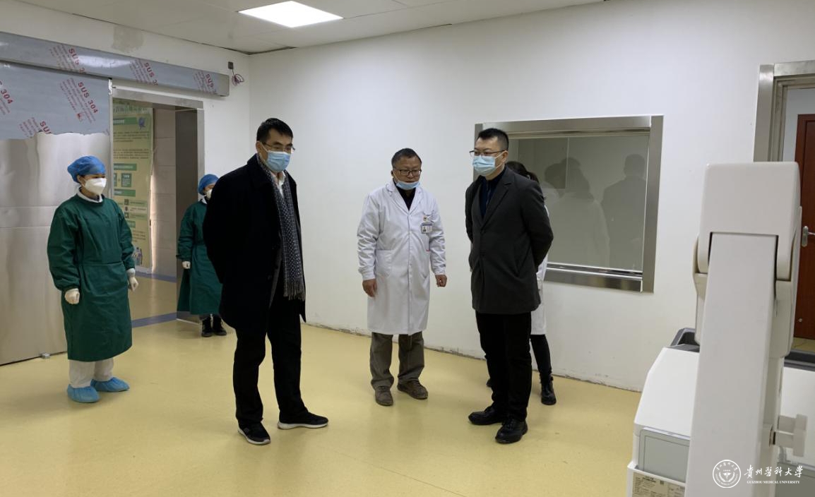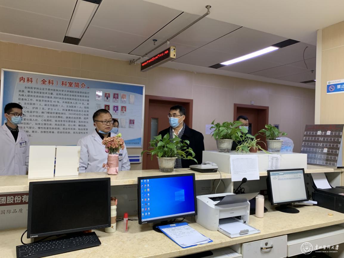 2月12日,大年初一,校党委副书记、校长罗鹏来到太阳成集团tyc33455cc官网大学城医院,慰问并视察春节医护的工作情况,大学城医院院长唐学杰、财务科负责人陈丽汇报有关情况。