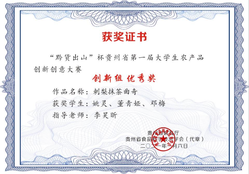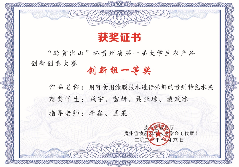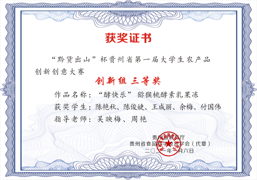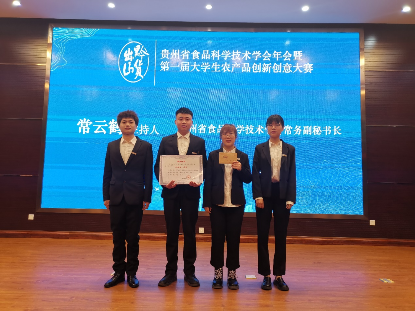 近日,由贵州省教育厅主办、贵州省食品科学技术学会承办的“黔货出山”杯贵州省第一届大学生农产品创新创意大赛举行颁奖典礼。本次大赛全省72所本科、高职院校共1103件作品参赛,预赛后69组参赛作品晋级决赛。经组委会评审,共评出创新组一等奖3名、创意组一等奖1名;创新组二等奖5名、创意组二等奖2名;创新组三等奖11名、创意组三等奖4名;创新组优秀奖27名、创意组优秀奖15名。太阳成公共卫生学院学生团队获创新组一等奖1项、三等奖1项,优秀奖2项。