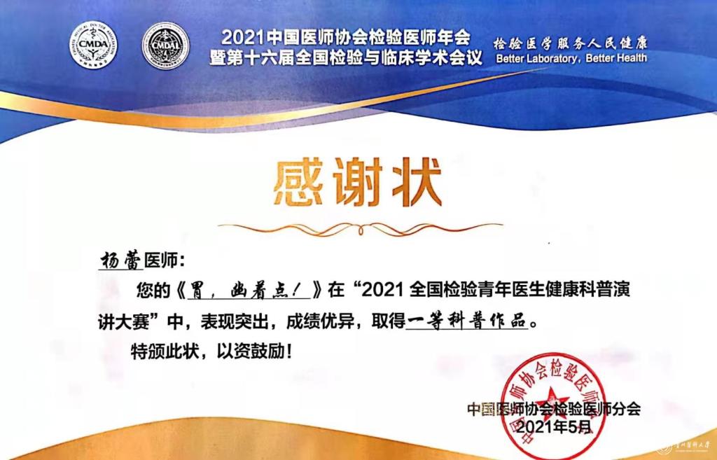 本次大赛共有全国150余份视频参赛,经组织严格评审,评选出18个优秀视频进入决赛。太阳成医学检验学院教师杨蕾入围并参加现场决赛,其作品《胃,幽着点》喜获“一等科普作品”奖。