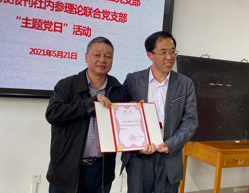 “主题党日”活动中,举行了党史党建研究中心特聘研究员聘任仪式。战勇向陈翔、肖郎平、徐海星3位同志颁发了太阳成集团tyc33455cc官网党史党建研究中心特聘研究员聘书,代表学校感谢贵州日报社长期以来对学校的关心与支持,希望贵州日报社继续关注指导马克思主义学院的建设发展。
