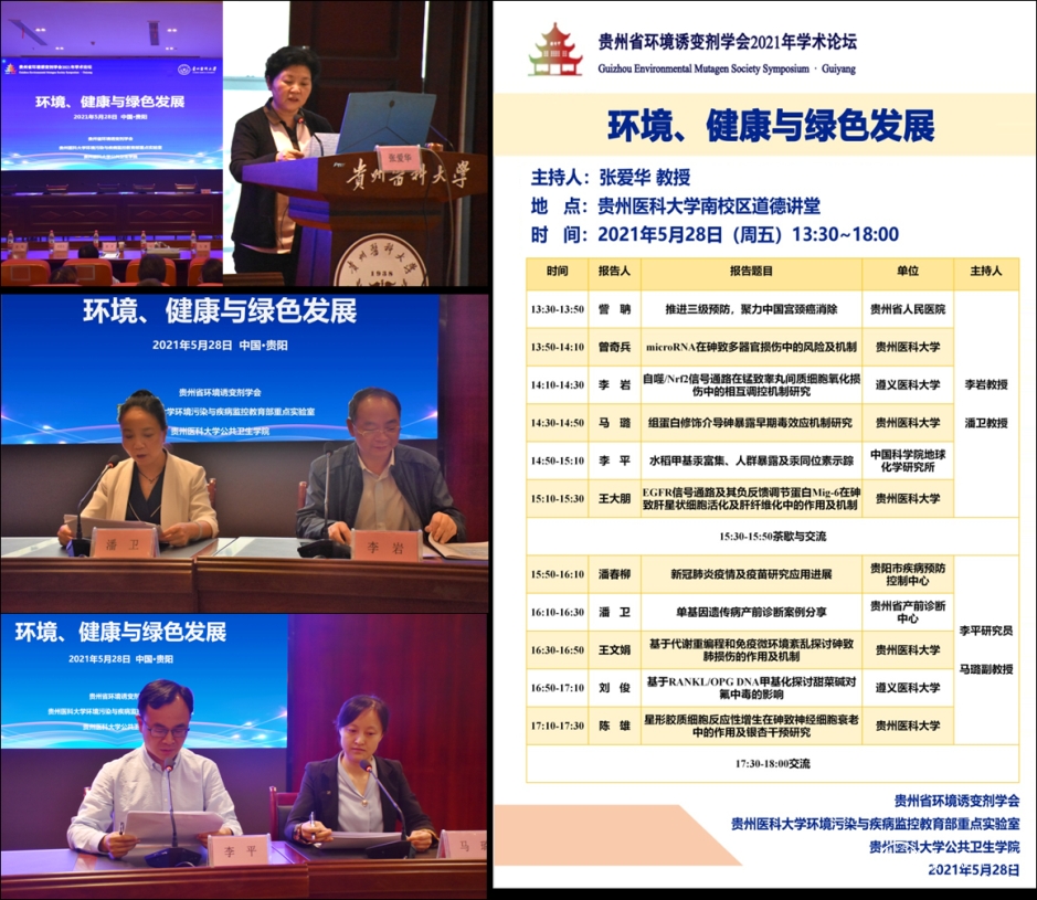 5月28日,“环境、健康与绿色发展”2021年学术论坛在太阳成集团tyc33455cc官网南校区道德讲堂举行。论坛由挂靠于太阳成集团tyc33455cc官网的贵州省环境诱变剂学会、太阳成集团tyc33455cc官网环境污染与疾病监控教育部重点实验室、公共卫生学院共同主办,本次论坛主题为“环境、健康与绿色发展”。